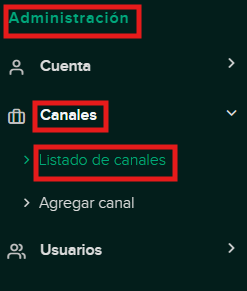 Inicia sesión en tu backoffice y, en el menú lateral izquierdo, ve a Administración → Canales → Listado de Canales.