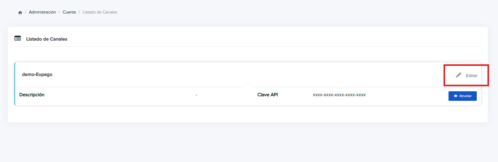 El callback se configura accediendo al backoffice de Eupago, editando el canal asociado a la clave API, siguiendo estos pasos:
