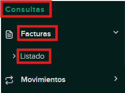 2. En el menú de la izquierda, hacer clic en la sección de Consulta, Facturas y Listado, como se muestra a continuación:
