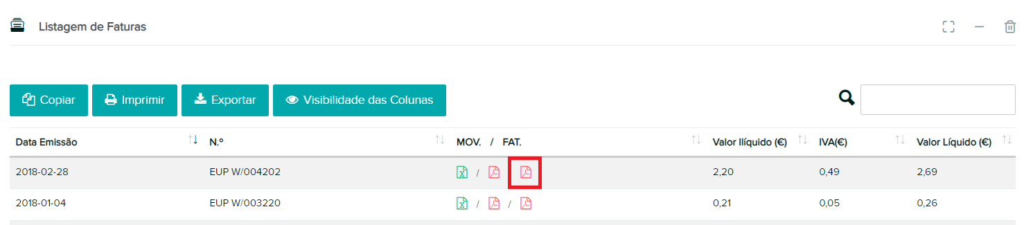 3. En la columna «FAT» , aparecerá un documento PDF con la factura correspondiente a cada