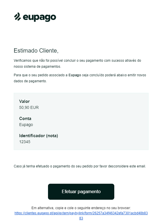 Failover es un servicio de Eupago que le permite ofrecer a sus clientes una nueva oportunidad para finalizar su pago, a través de una solicitud por correo electrónico o SMS enviada al cliente final.