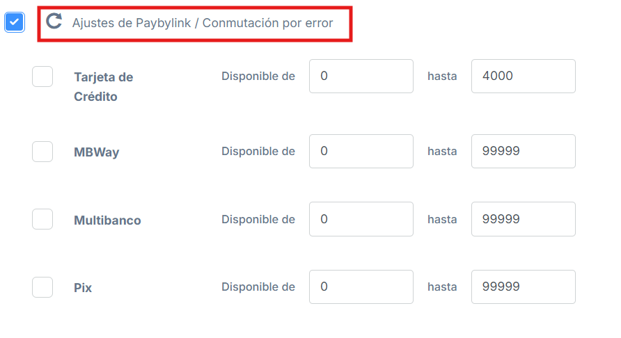 Desplácese hasta encontrar la opción 'Ajustes de Paybylink / Conmutación por error' y selecciónela.