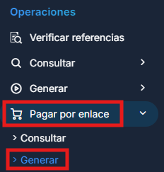 2. Una vez activados los métodos de pago, para generar una referencia mediante Pay by Link, diríjase al apartado 'Operaciones' → 'Pagar por enlace' → 'Generar'.